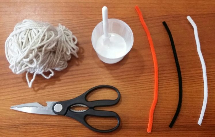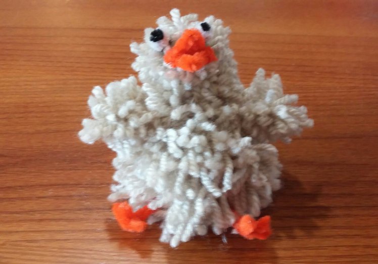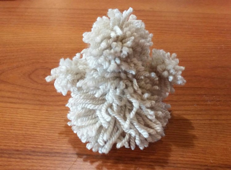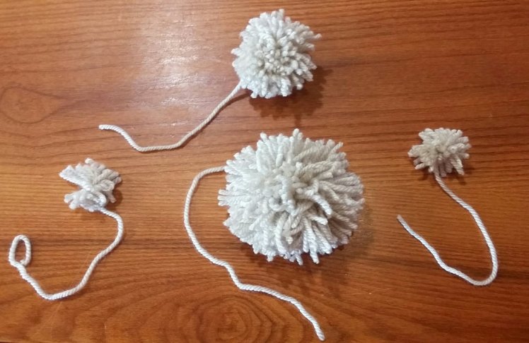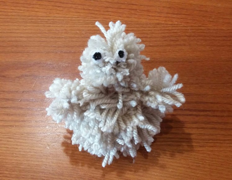 There are several different ways you could make your pompoms. The quickest method is to wrap the wool around your fingers. For the body pompom, wrap around four fingers, and for the head pompom, wrap around just two. For these first two pompoms, use plenty of wool, that way you have a good sized, dense pompom once you’re done. For the wing pompoms, again wrap around two fingers, but his time use only half the amount of wool, so the pompoms are smaller.
