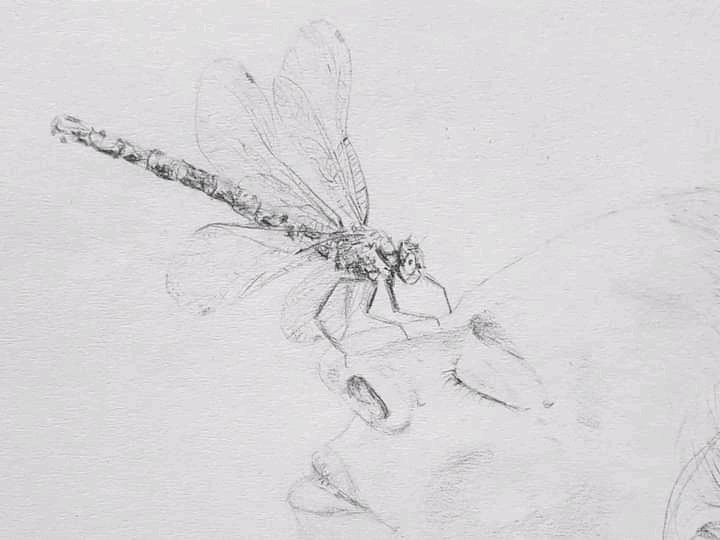 I never did manage to photograph a dragonfly. I instead sketched out the beautiful moment in which I received some dragonfly kisses once I arrived home.
