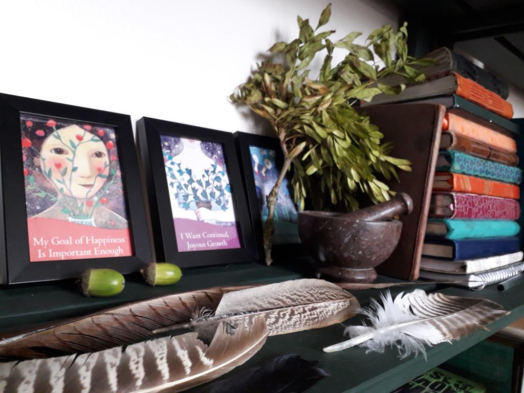 Sometimes I take my little gifts home with me, though often I’ll leave them on a tree stump, in a hollow bowl of a tree, or tied with a thread to a tree branch. I have a shelf on my bookcase that is now starting to get quite a collection of feathers.