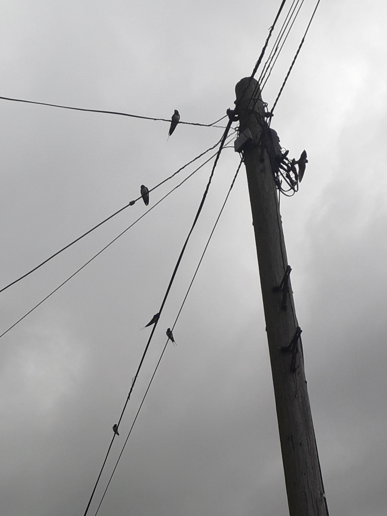 This flight of swallows was swooping overhead as I walked along the lane. Most remained perched on the telegraph wires only briefly before diving out after flies, only to return a moment later. I just had to stop for a time to watch them, and snap a few pictures, too, of course.