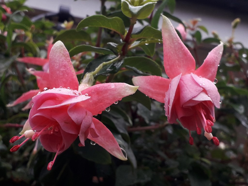 Day 88 of 365 Days Wild was another day of constant rainshowers, so I decided to spend some time out in my dad’s garden rather than going out for another walk in the rain. I particularly enjoyed the sight of the geraniums and the fuschias, bejeweled as they were in beautifully pristine droplets.