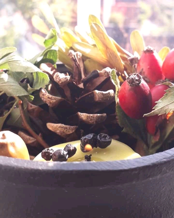 I like to celebrate the season by collecting a selection of hedge row fruits and nuts.