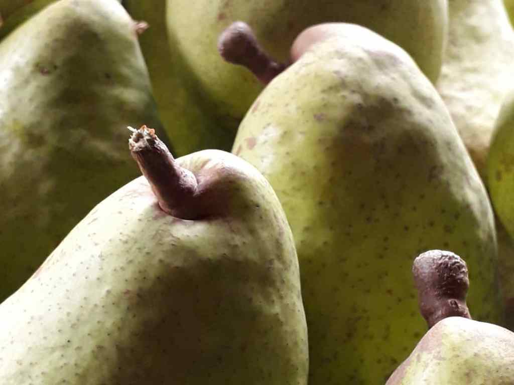 We have six different fruit trees – two pear, three apple, and a damson. One of the pear trees was starting to drop its fruit so we thought it best to harvest them before the strong winds brought them all down. This year’s crop consists of a relatively small number of very large pears. Some of the weigh over 1lb / 450g each. This is possibly because there was a lot of natural droppage back in June, allowing the tree to push lots of energy into those that remained and grow them to a large size.