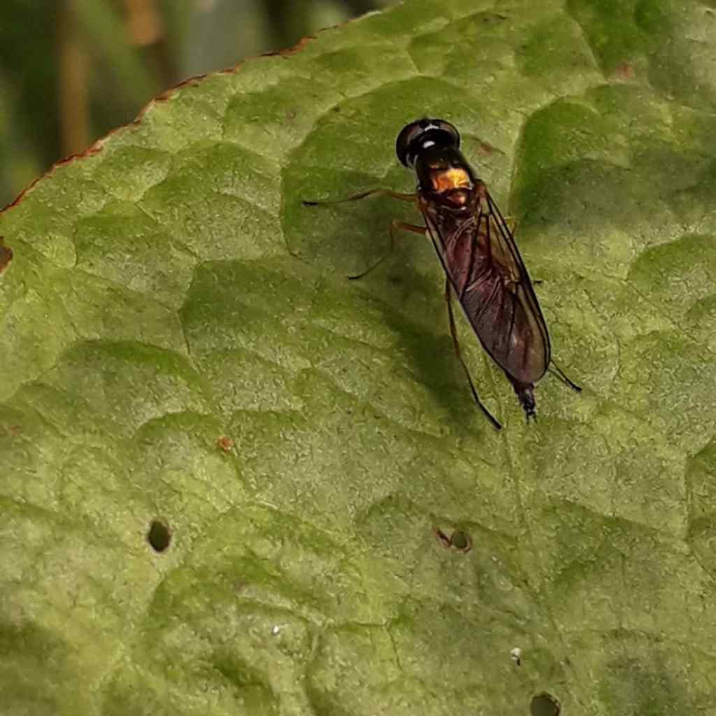 A slender fly with a slightly iridescent form settled on a leaf beside me as I photographed. I’m pretty sure that it’s a type of Centurion Fly, of which there are four different types in the UK. I think this one is a female Yellow-legged Centurion fly.