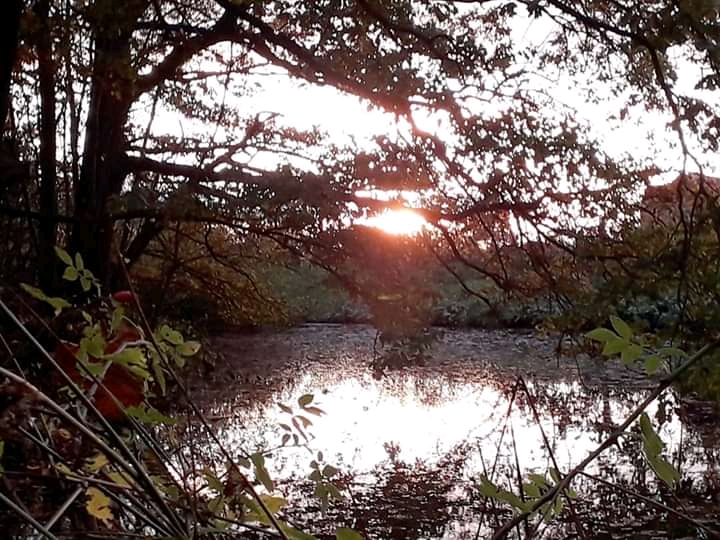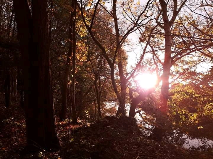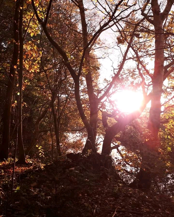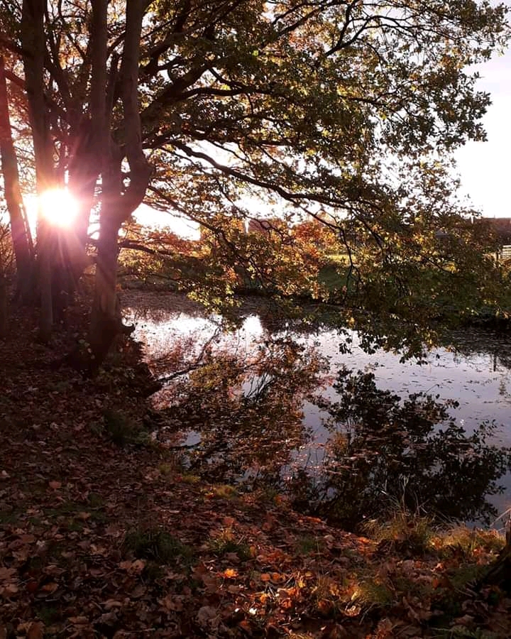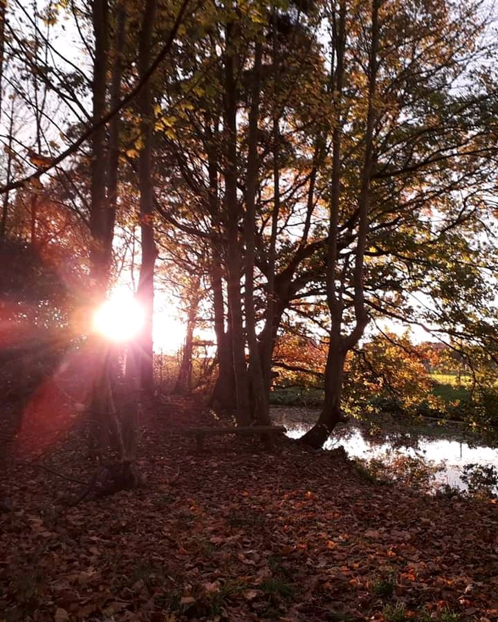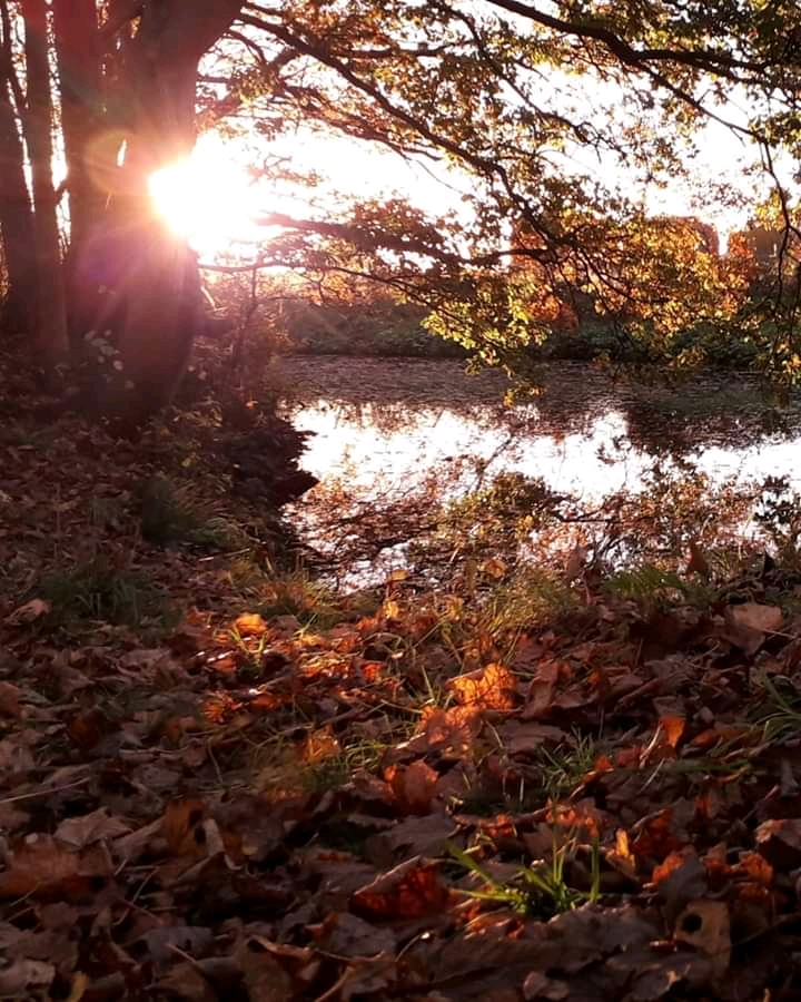 I swiftly made my way back to the little woodland and the pond, where sunbeams burst through the trees and shattered over the water.