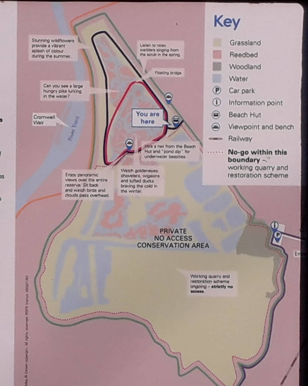 If you fancy paying to visit Langford Lowfields Nature Reserve, access is from Cottage Lane in the Nottinghamshire village of Collingham. The postcode for your satnav is NG23 7RF. It is open from dawn until dusk all year round and entrance is free, though a parking donation of £1 for less than 2 hours or £2 for more than 2 hours is suggested. There is a public footpath from the car park that passes through the woodland and along the boundary path. Once you are within the reserve there are several different paths that you could follow depending on how energetic you’re feeling. The Langford Lowfields trail is 4.5 miles in length, the North Trail is 1.5 miles, and the Cromwell Trail is 1 mile. Alternatively, if you’re wanting a longer walk you could also join the Trent Valley Way, a footpath that follows the course of the River Trent along its entire 166 mile length. Whilst cycling is not permitted past the Beach Hut near the entrance to the reserve, the Sustrans 64 cycling trail, that connects Nottingham with Lincoln, is also accessible nearby.