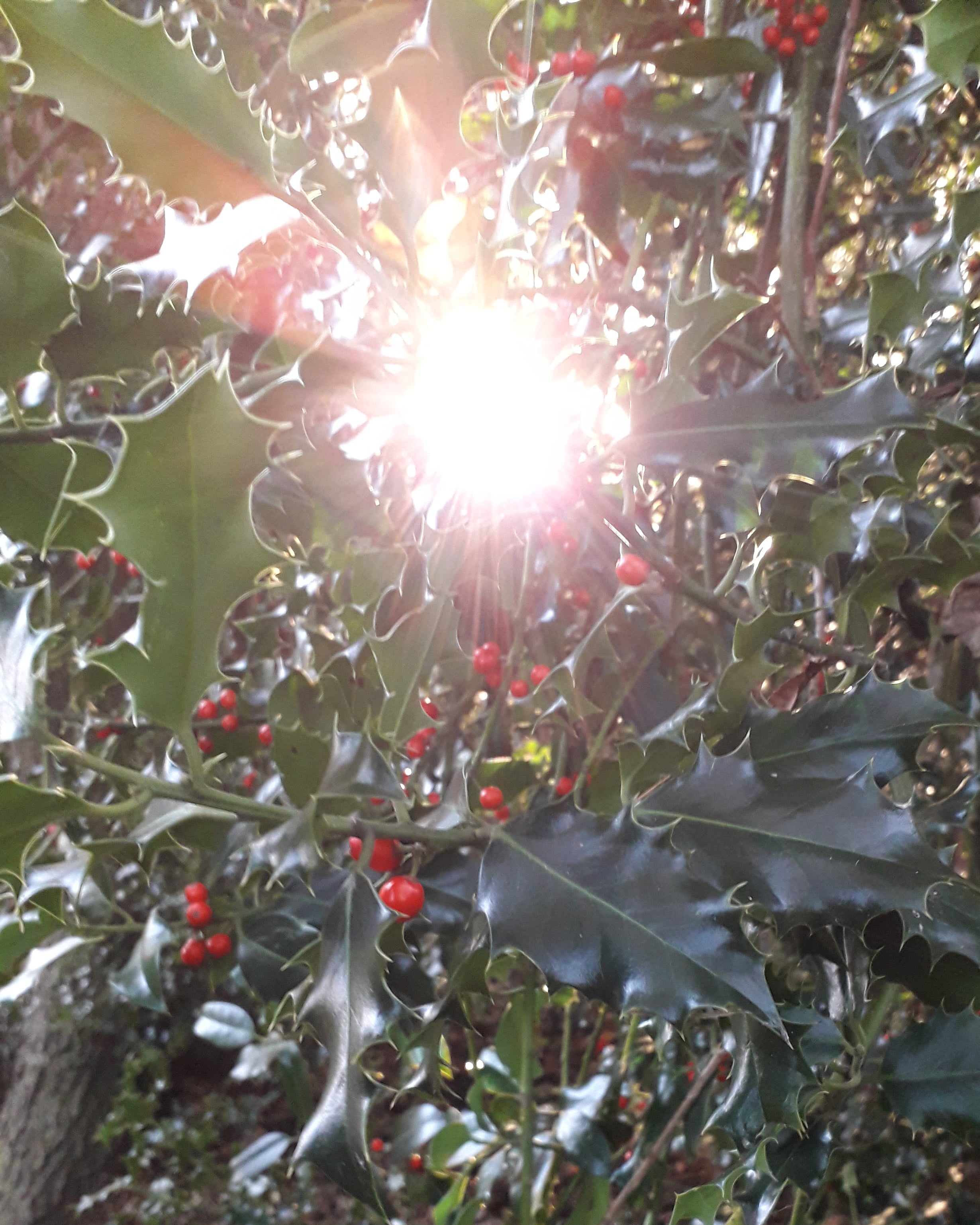 The holly is possibly the quintessential Winter tree. With its spiky, richly coloured evergreen leaves and vivid red berries, it has been used for many years to decorate homes for various Midwinter festivals. Nowadays it is particularly associated with Christmas. In Chrstian folklore, the sharp leaves of the holly symbolise the crown of thorns worn by Christ. The red of the berries represent his spilled blood. It is also said that holly sprang up in his footsteps.
