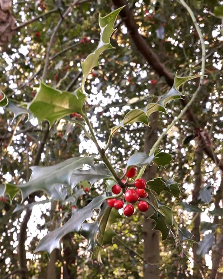 The name ‘holly’ in English comes from the Anglo-Saxon word ‘holegn‘, which in turn is derived from the Proto-Germanic ‘hulin-‘, which can be traced back to the PIE (Paleo-Indo-European) root word ‘kel-‘. The Scottish Gaelic name for holly is ‘chuillin‘, which has the same PIE root. This root word, appropriately, means “to prick”. Its name is also sometimes thought to be derived from “holy tree”. In Germany it is known as ‘christdorn‘, which translates as “Christ-thorn”, a local name that is also found in the UK. Other local names include, Aunt Mary’s tree, Crocodile, Hollin, Prick-bush, Hulber, and Killin.