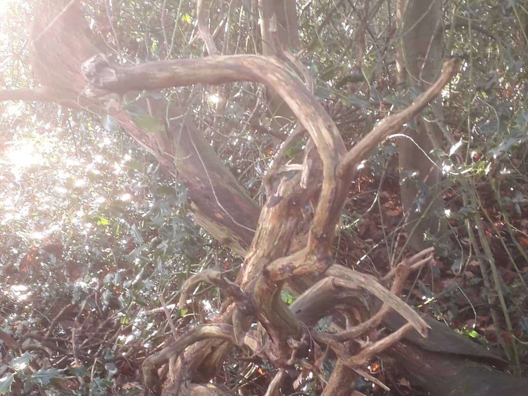 I spent some time with the tangle of dead wood near the holly trees. I love how some of the worn spikes of branches look almost like antlers, turning the dead wood into a host of leaping, prancing deer running through the woodland.