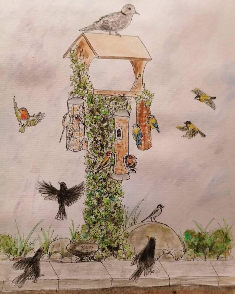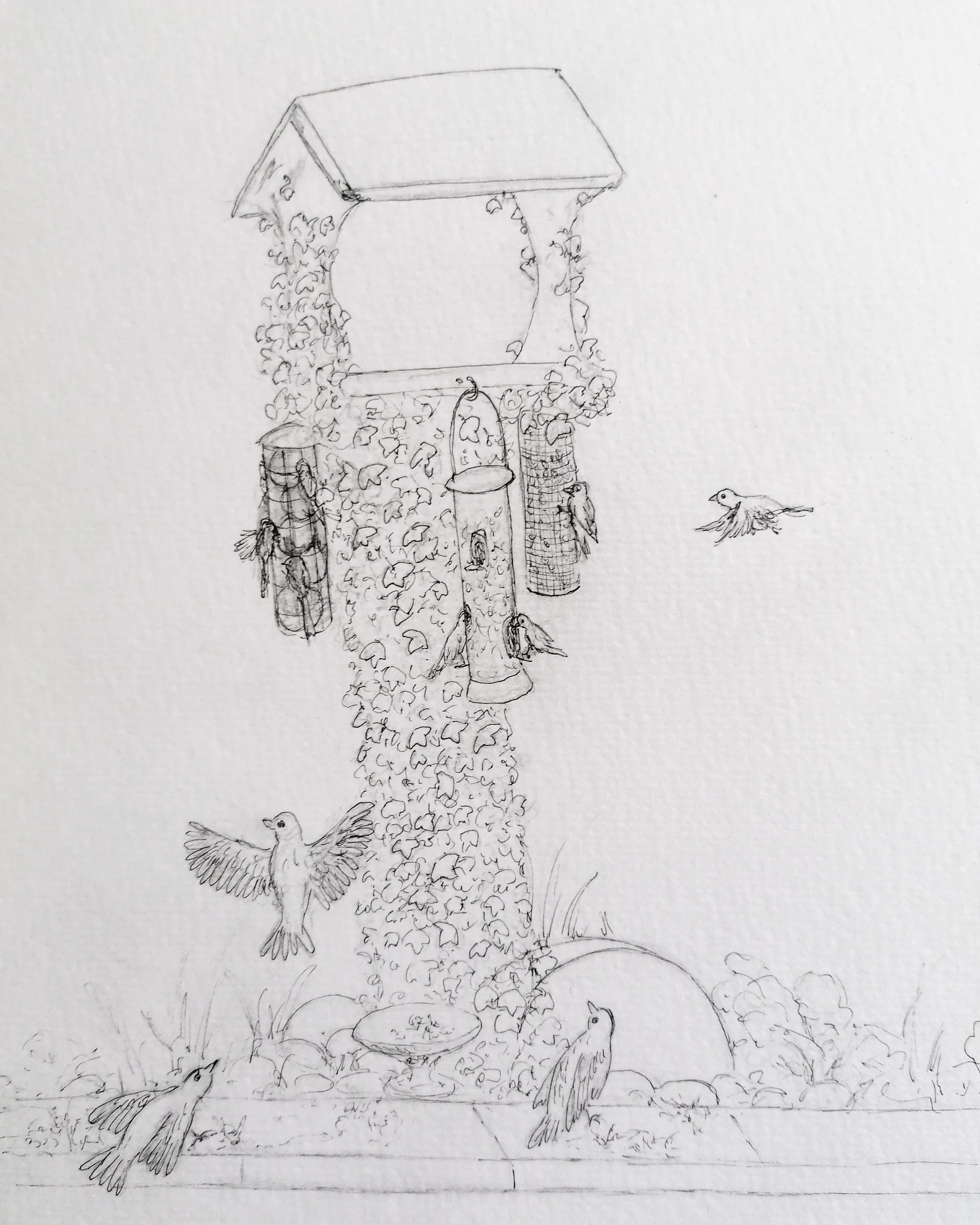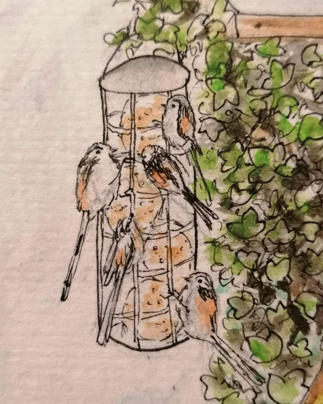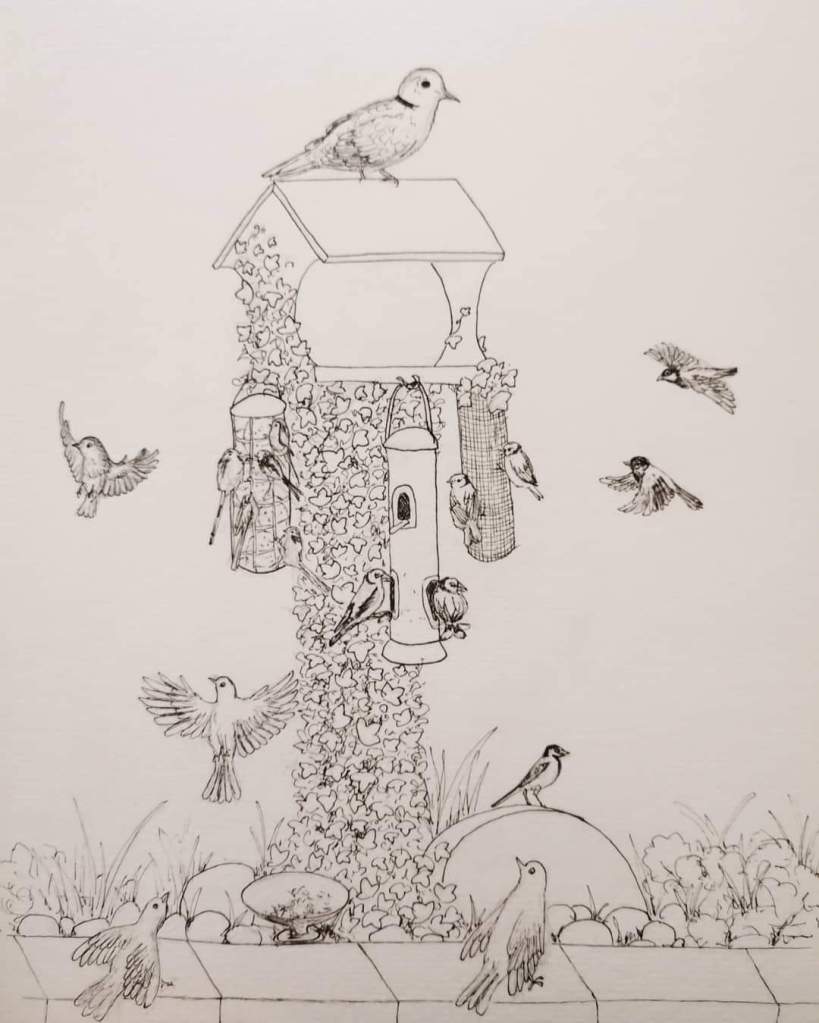 After I finished sketching I decided to try a larger picture of the bird table surrounded by all of the garden birds that fly into our garden. This picture ended up taking me far longer to complete than I’d expected. I abandoned my first attempt after adding some ink to the sketch. It just wasn’t quite right. The bird table was wonky and there just wasn’t enough detail on the different birds on the hangers.