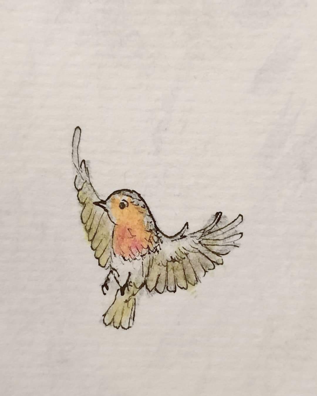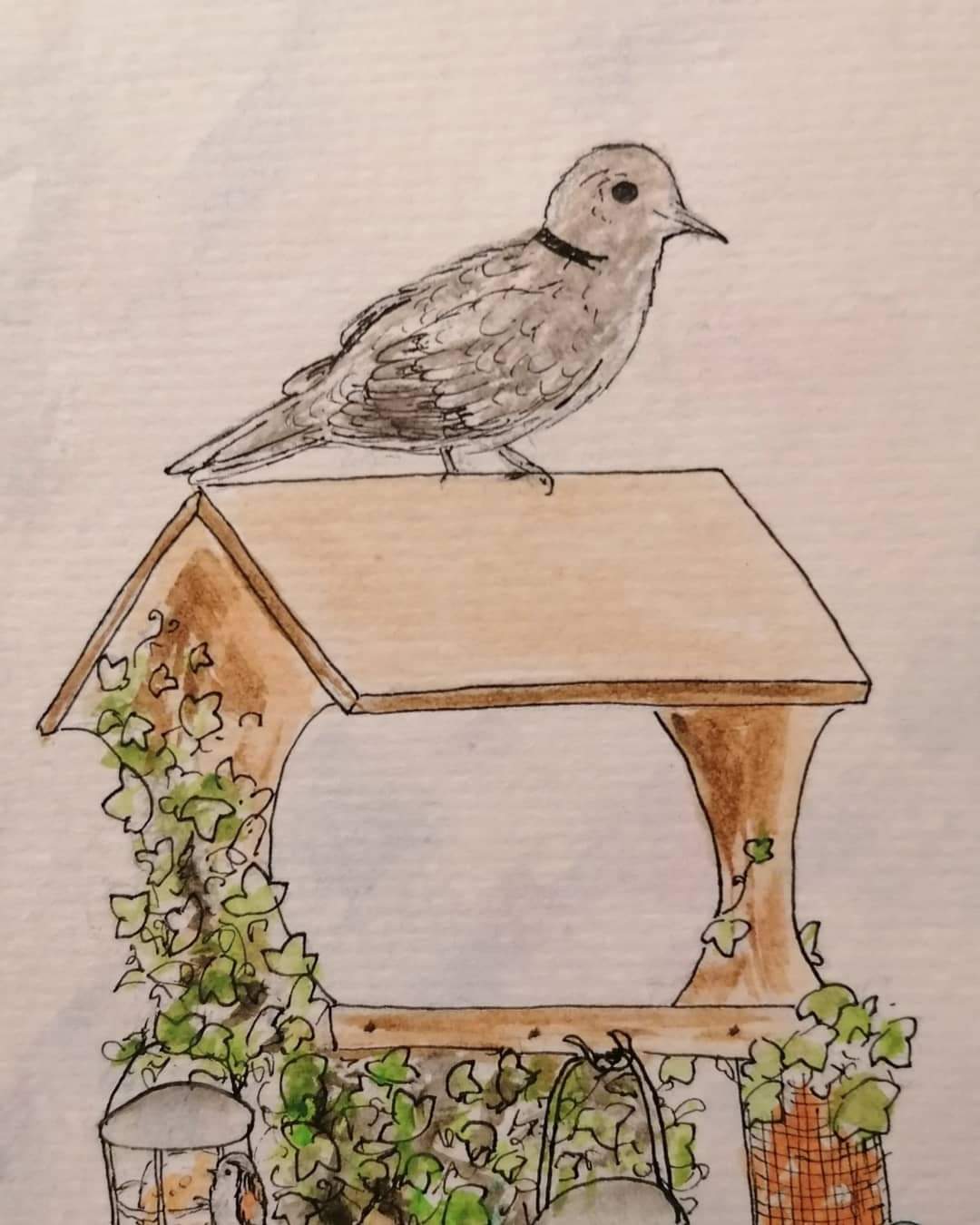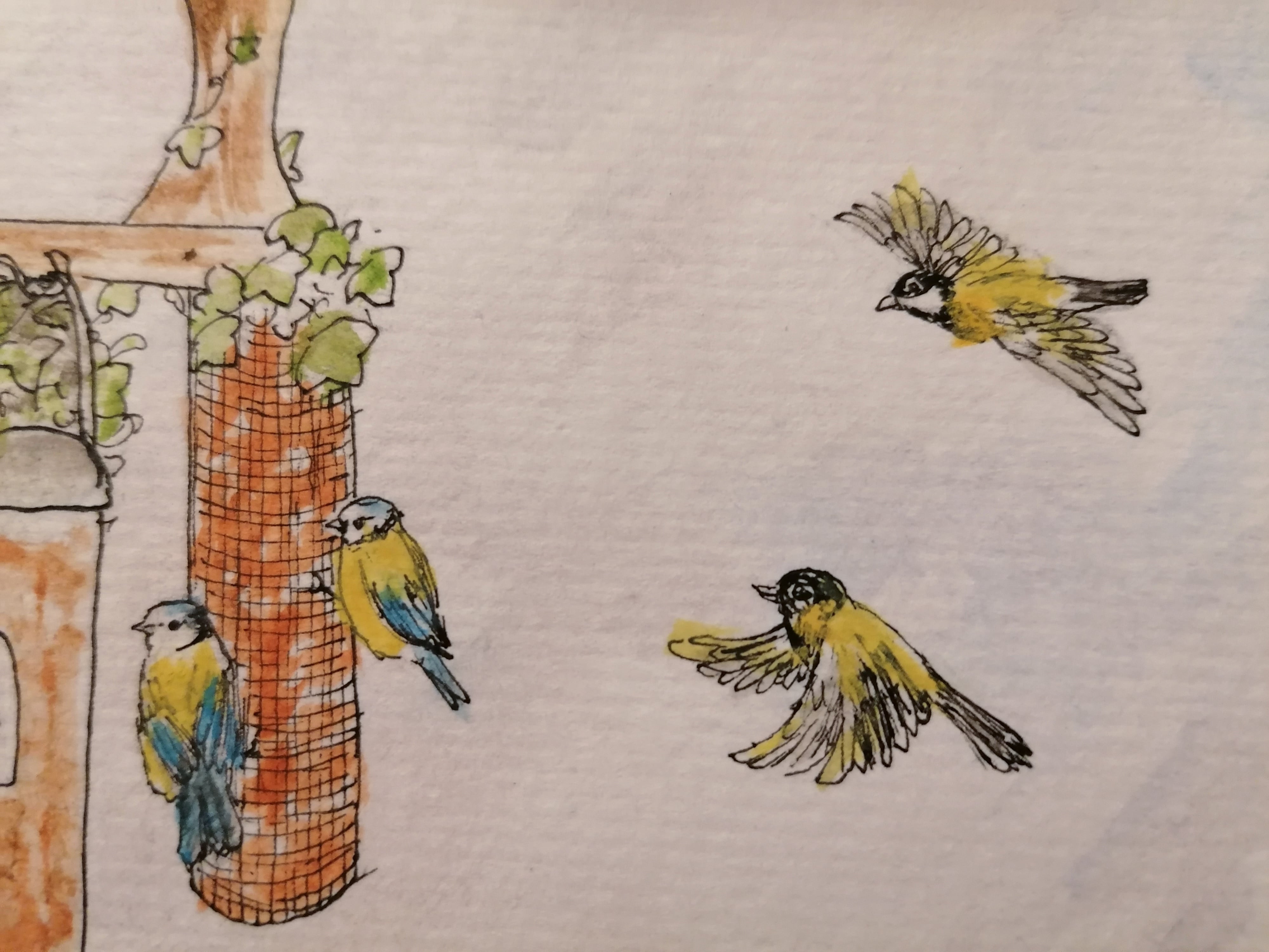 After I finished sketching I decided to try a larger picture of the bird table surrounded by all of the garden birds that fly into our garden. This picture ended up taking me far longer to complete than I’d expected. I abandoned my first attempt after adding some ink to the sketch. It just wasn’t quite right. The bird table was wonky and there just wasn’t enough detail on the different birds on the hangers.