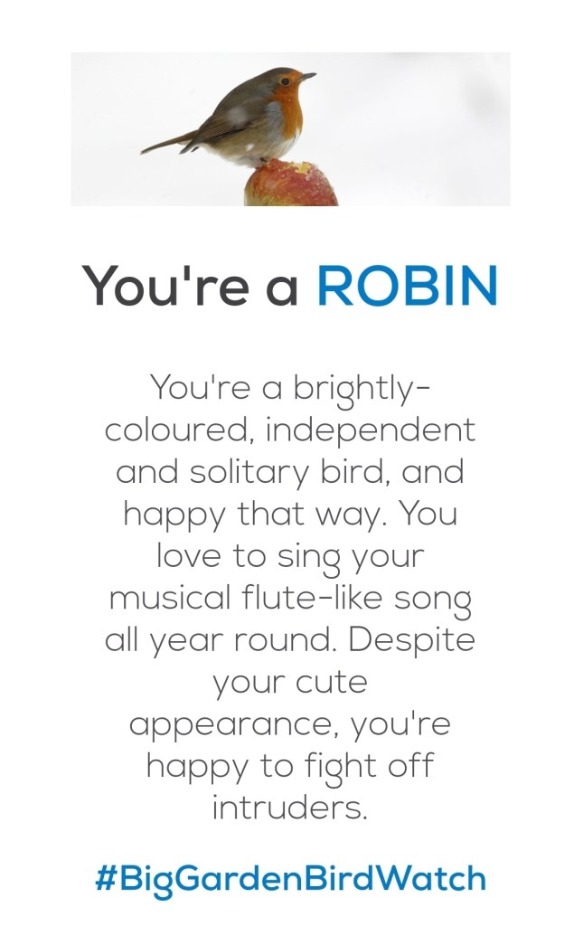 If you fancy trying out something a little different, there’s also a little quiz on the RSPB website that you can do to find out what sort of bird you are. I’m a Robin it seems.