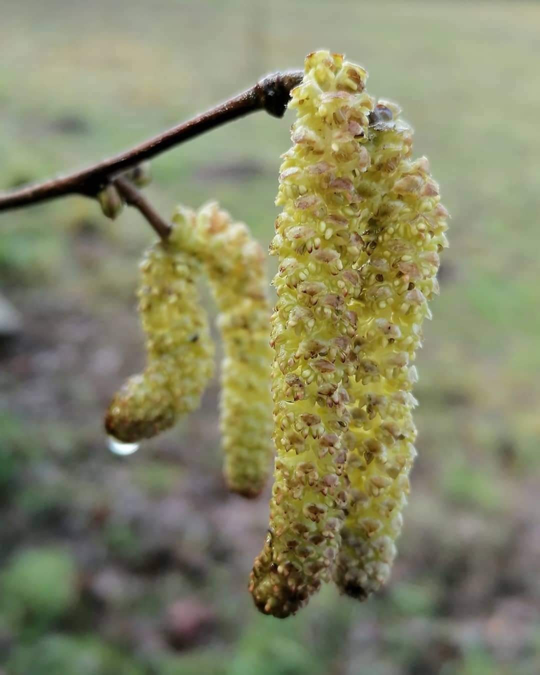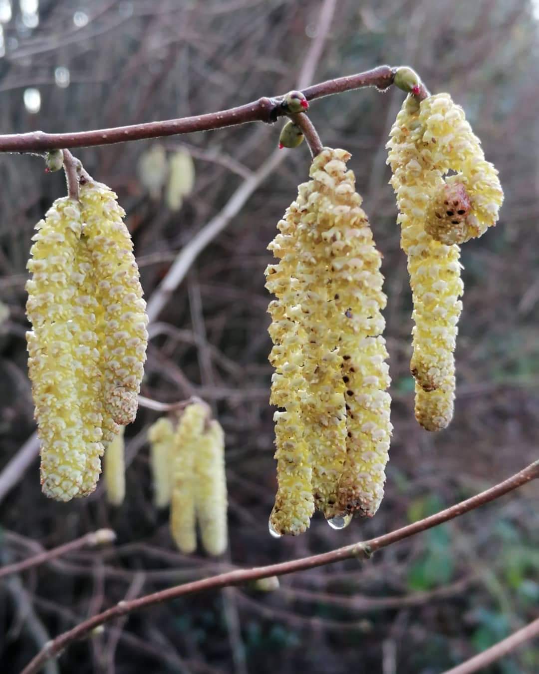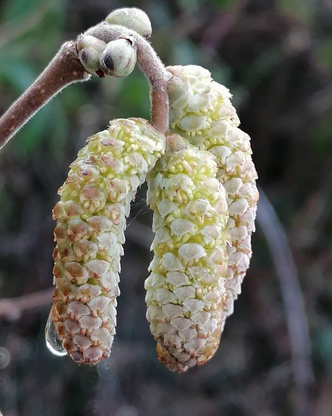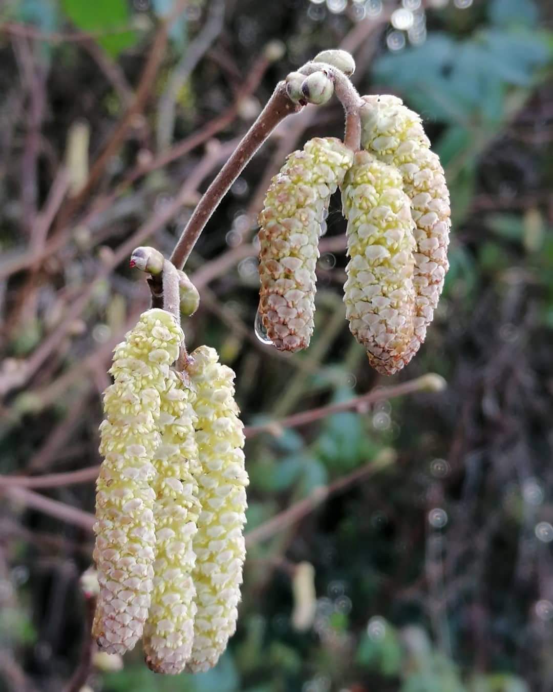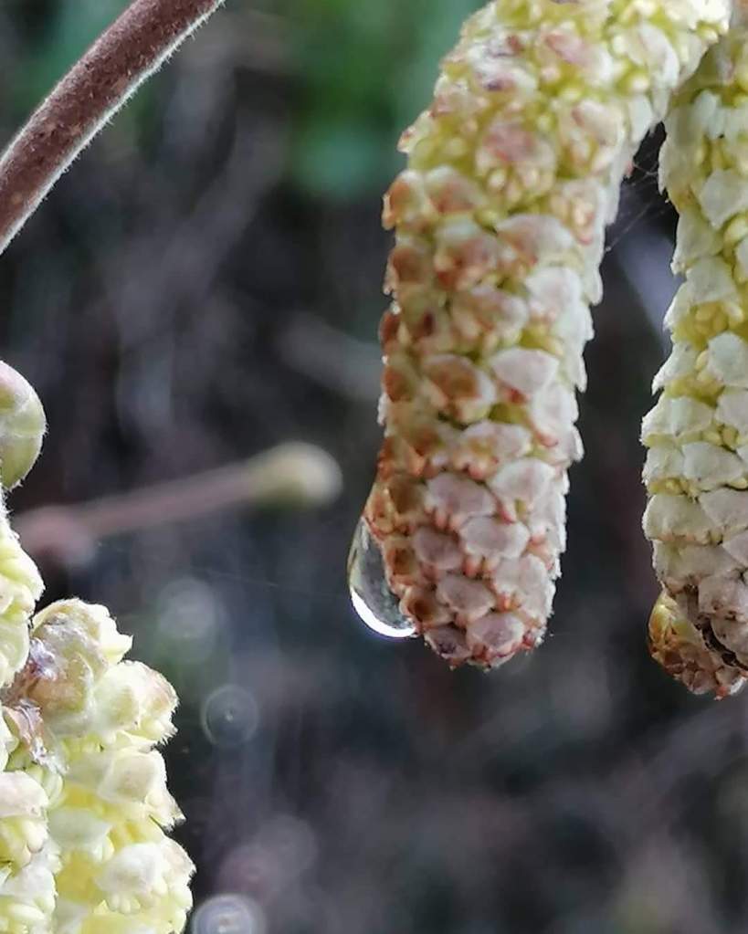 There were raindrops still clinging to many of the catkins after the downpour that we’d had earlier in the morning. I couldn’t resist photographing them. Catkins are the male flowers of the hazel tree. They make their appearance in the Spring and are also known as lamb’s-tails.