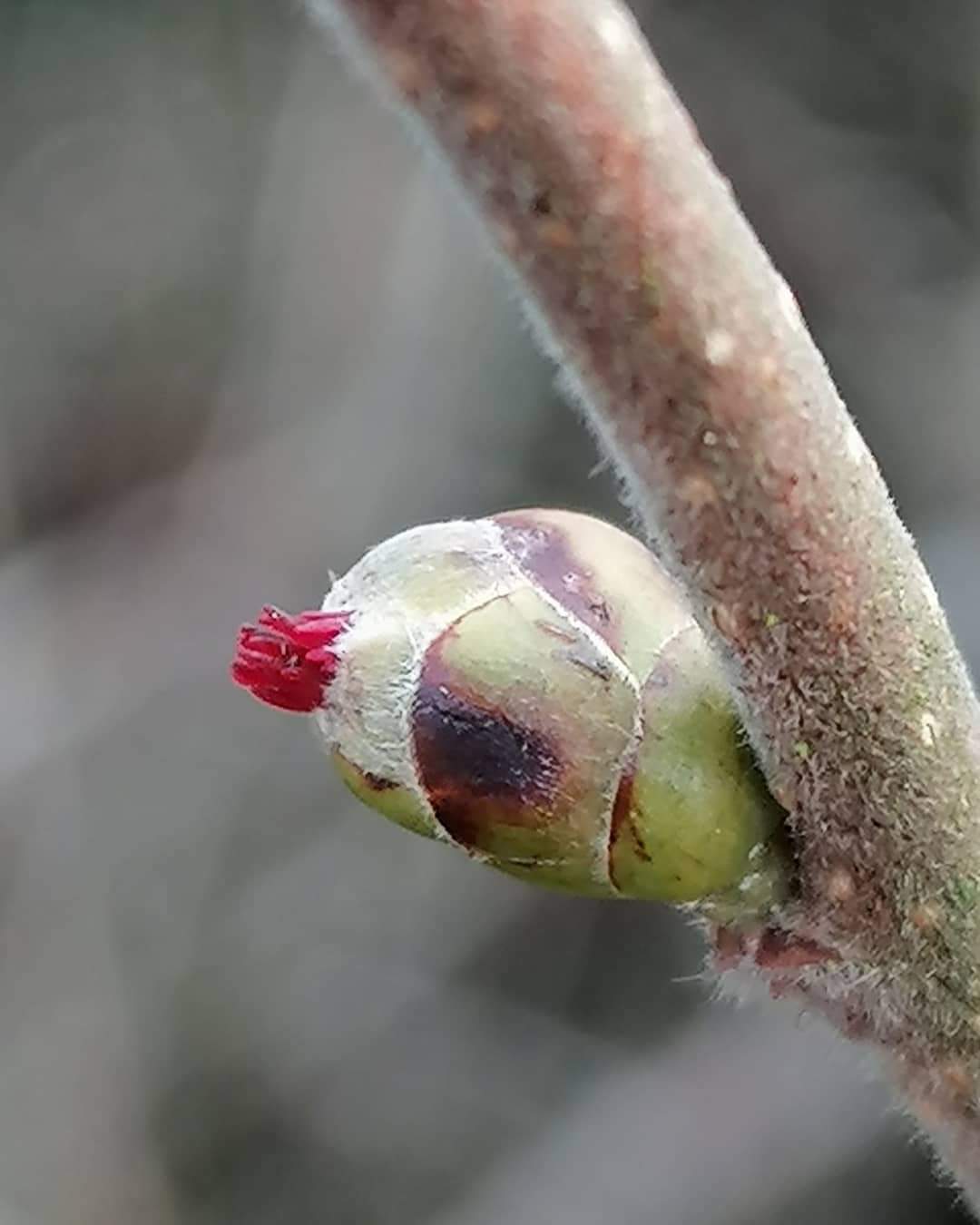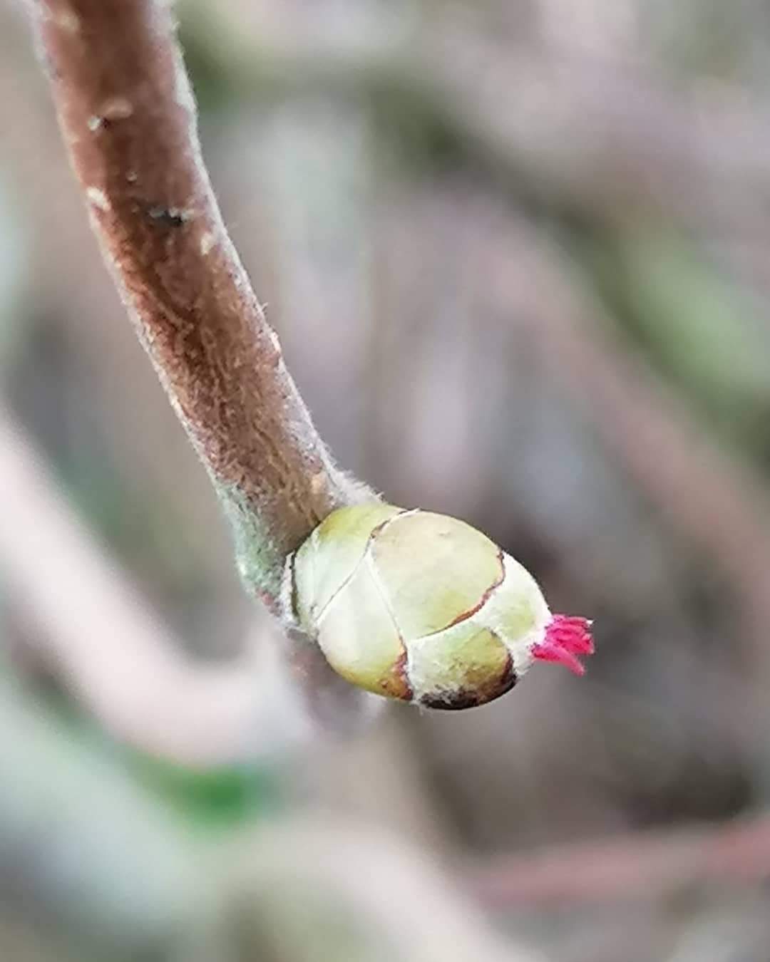 I thought at first that these little pink tufts were buds starting to open. It seems that they’re are actually the female flowers, from which hazelnuts would develop if they were fertilised by another hazel tree. I’ve never noticed hazelnuts in this stretch of hedge so there must not be another one anywhere else nearby.