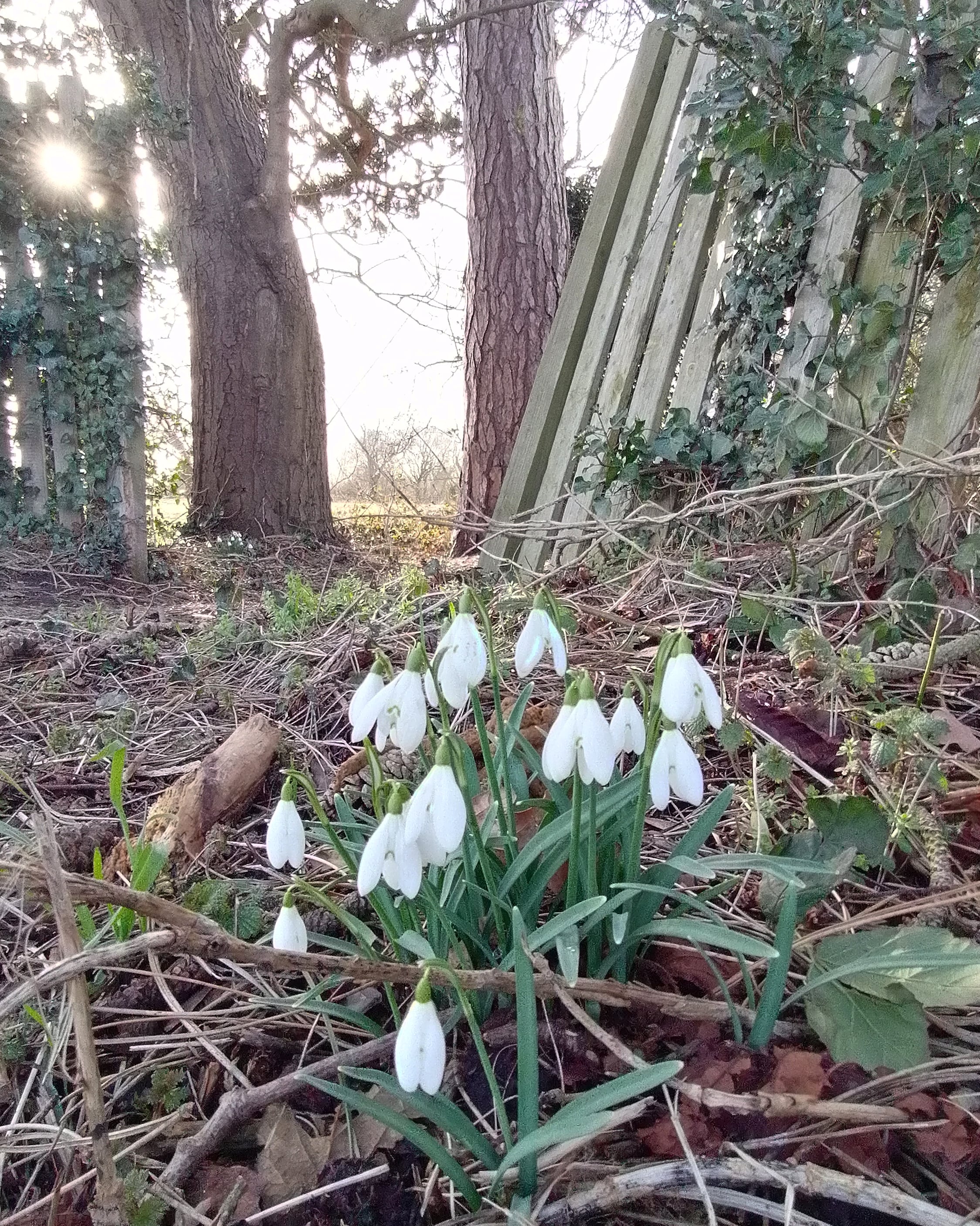I briefly stopped at the entrance to the meadow and the Millennium Walk. There’s a lovely little clump of snowdrops by the wonky fence and the sun was bursting through the ivy. I just had to take some photos.