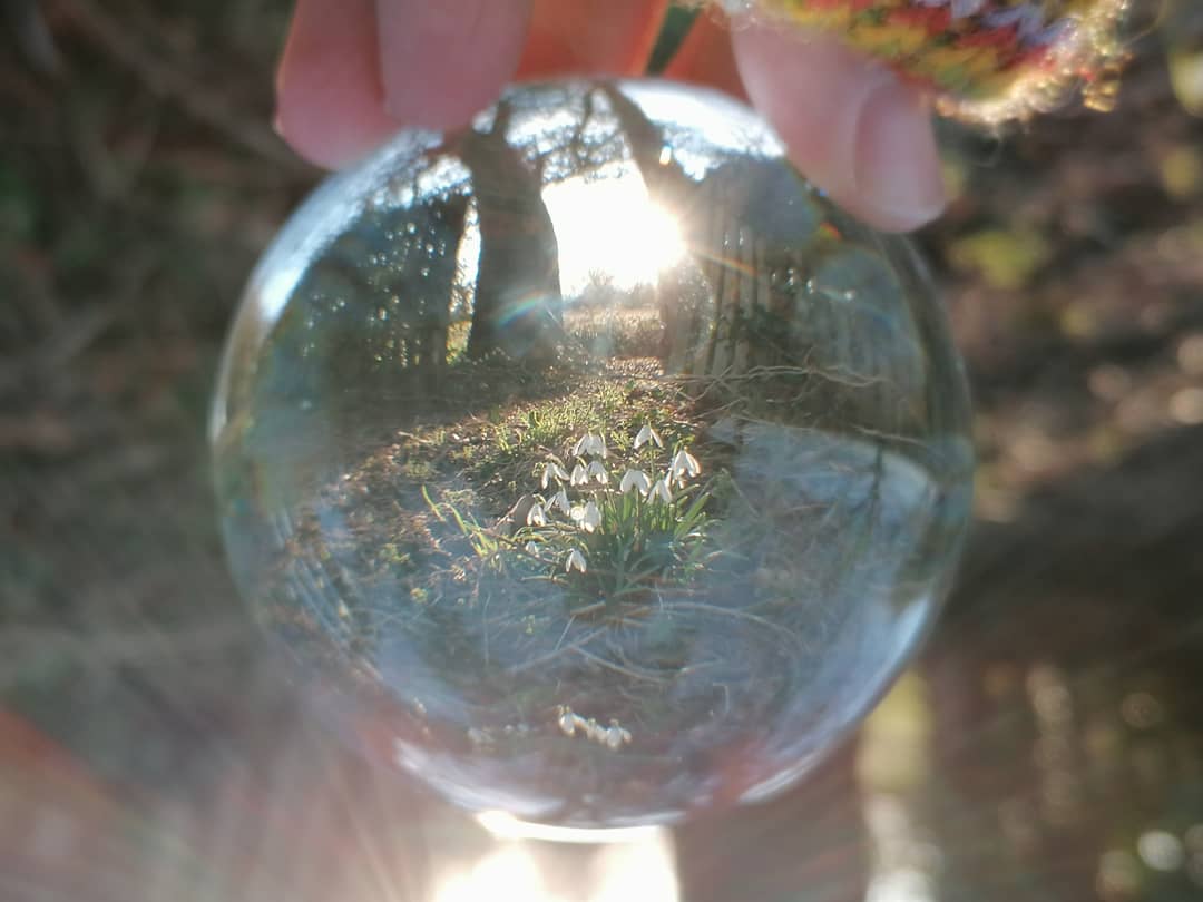 On day 266 of 365 Days Wild I ventured out with my lens ball in hand to see what magical pictures I could capture. The woodland paths, pond and meadow all looked lovely captured in the crystal ball, especially as sunset approached, though my favourite subjects were the snowdrops.