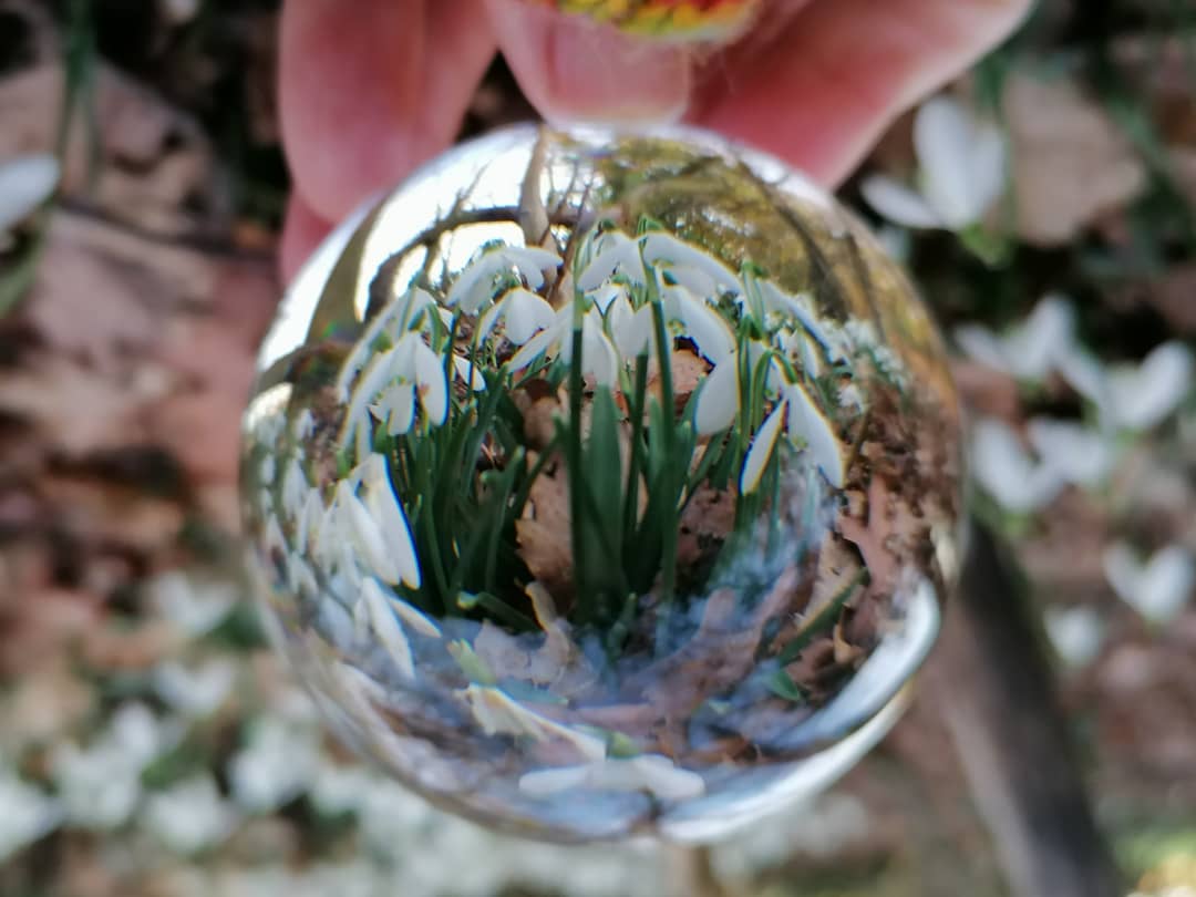 I’ve never seen a lens ball. Such creative possibilities. I kept strolling to choose one and eventually settled on the first snowdrops; however the one less close up with the ivy foreground was a strong contender