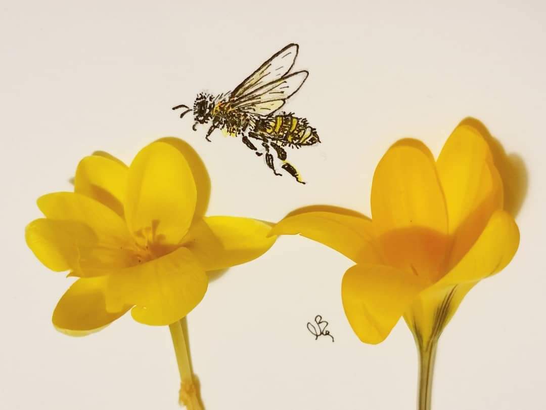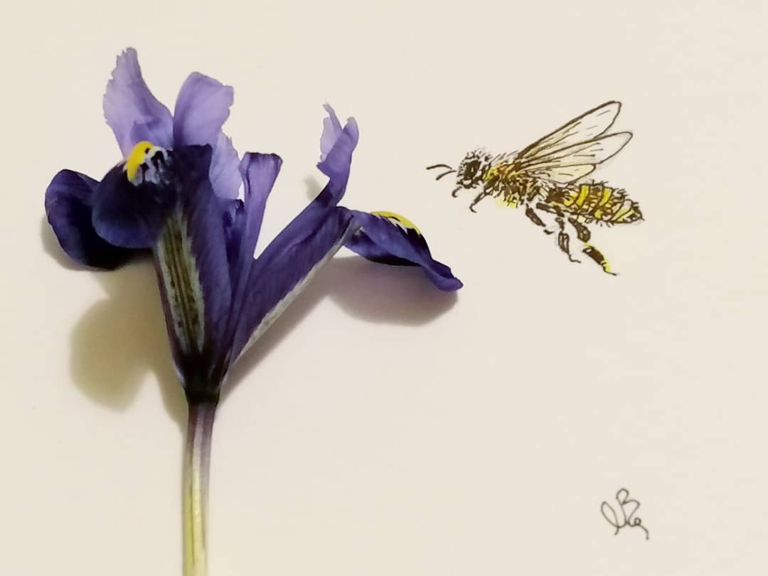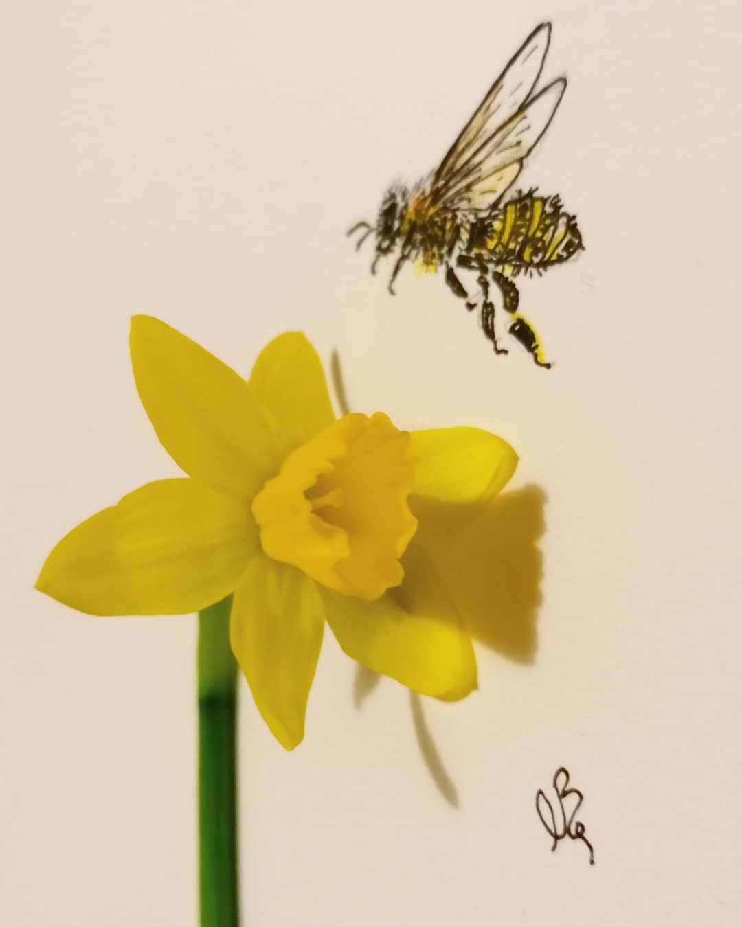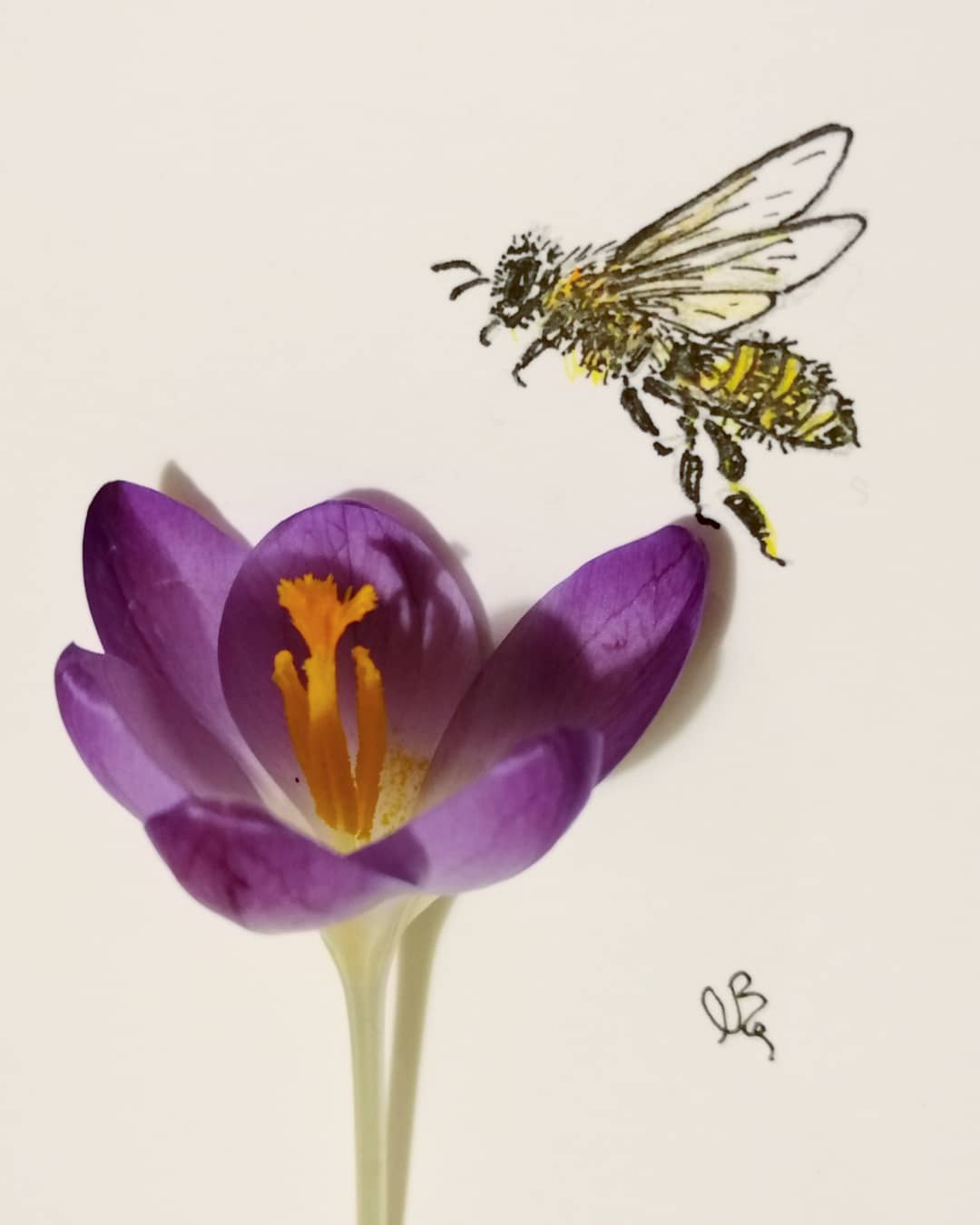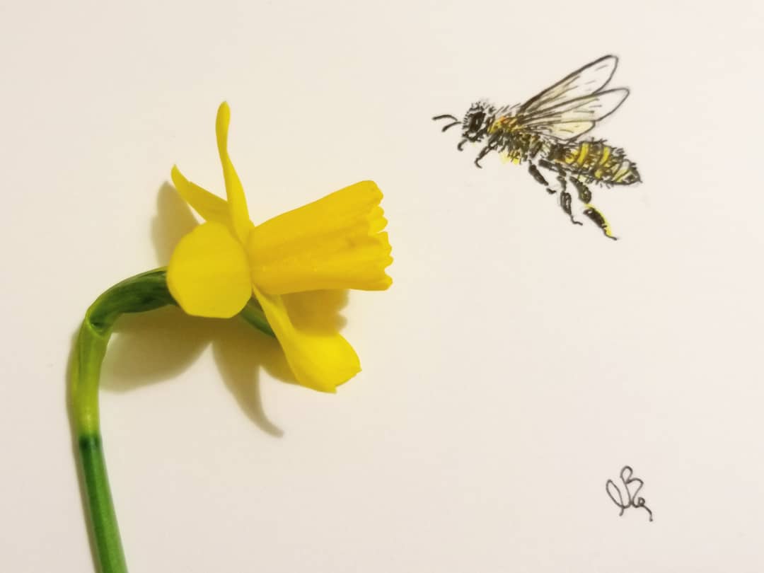 It was a little bit later in the day when I spotted my first bee of the year in the garden. It buzzed past me and was gone too quickly for me to snap a photograph, or even to get a proper look at it. I have no idea what species it was. To immortalise the occasion I thought I’d draw a little bee picture and create a few different images using the posey flowers that I’d collected earlier.