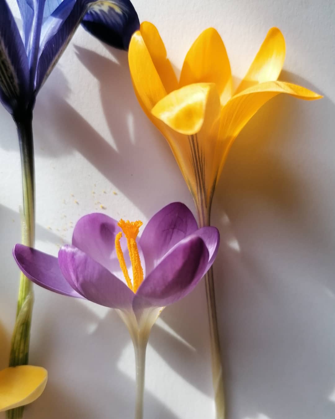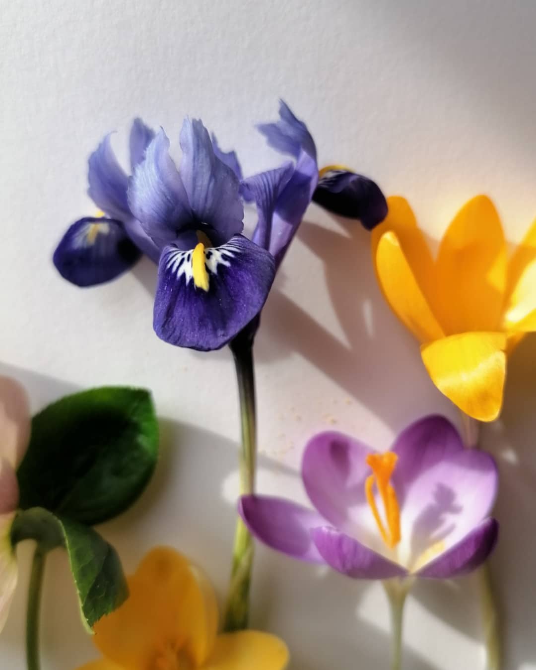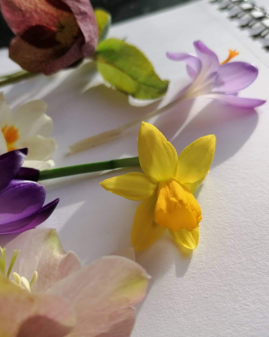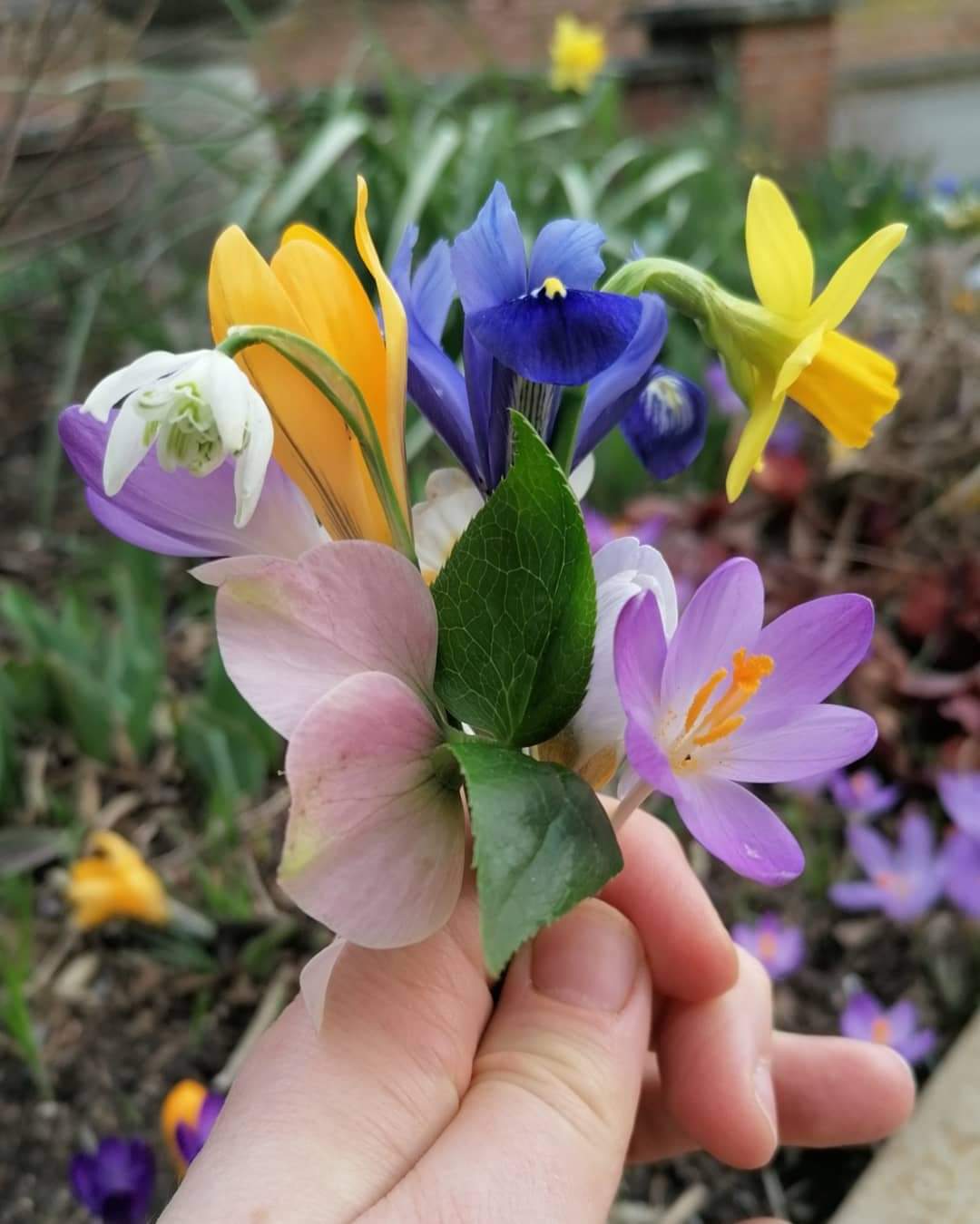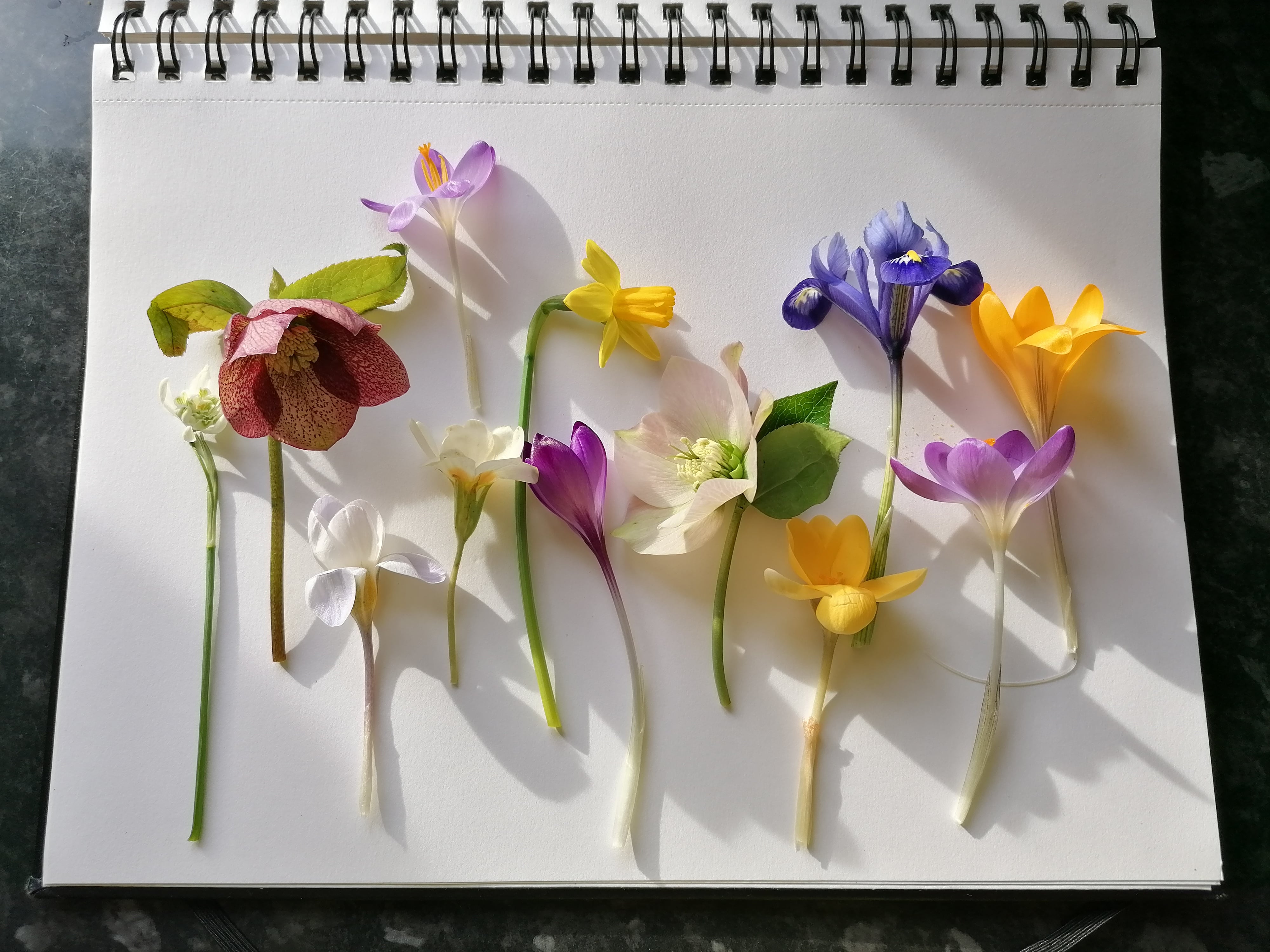 I collected one of each different coloured crocus, plus two different hellebores, a snowdrop, a few different polyanthus, a dwarf daffodil and an iris. They