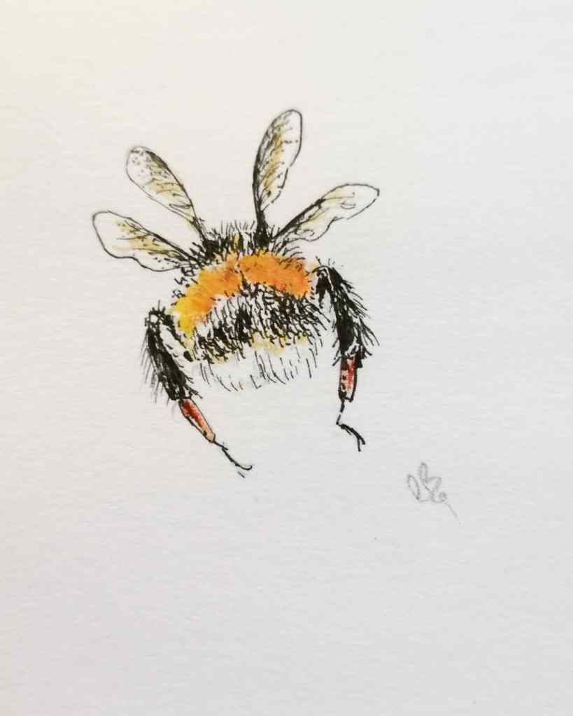 First I drew a bee, using ink pen and some ink crayon applied with a paint brush. This time I drew a white tailed bumblebee from behind, using random pictures from Google as reference. There’s just something irresistible about a bumblebee bum!