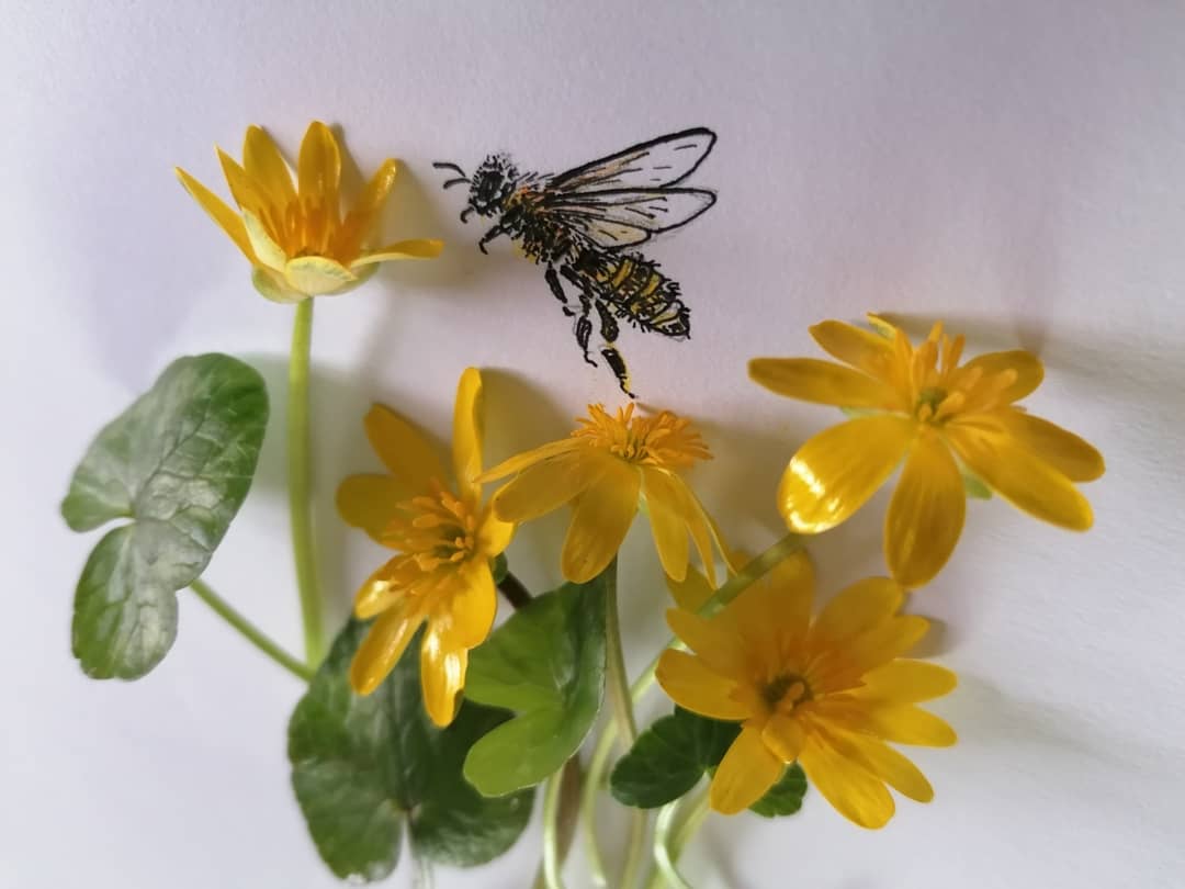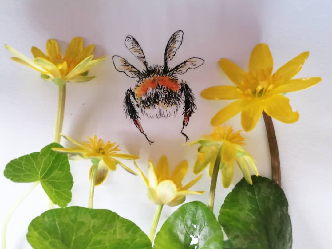 For day 286 of 365 Days Wild I decided to add another bee drawing to my collection. I also popped out to collect a small handful of the Celandines that are flowering on the grass verges around the village. As always, I only pick a flower from a patch where are lots of them, and only one from each patch. The bees need them more than I do.