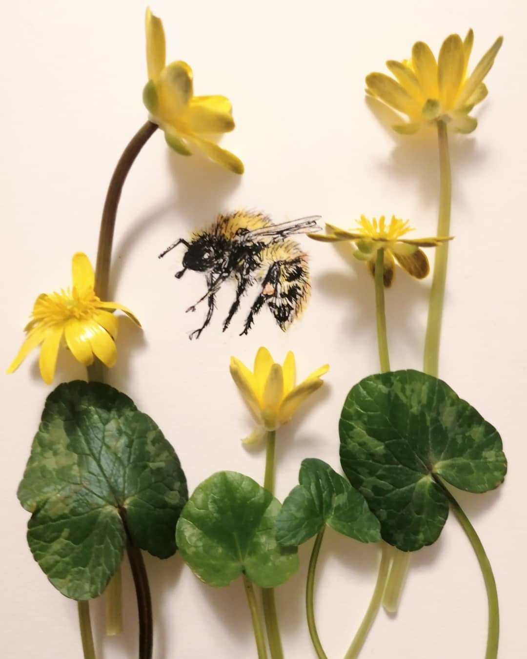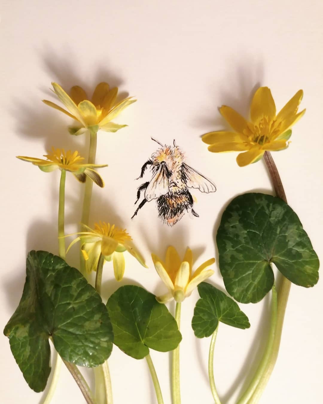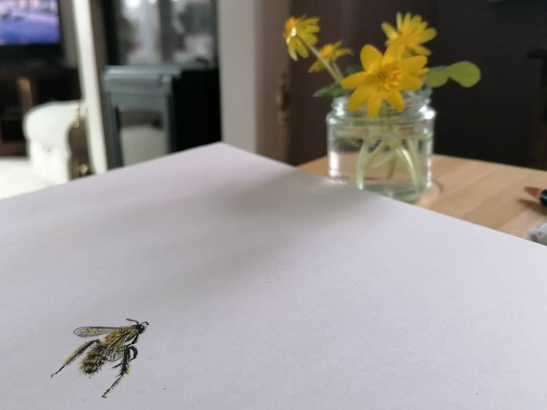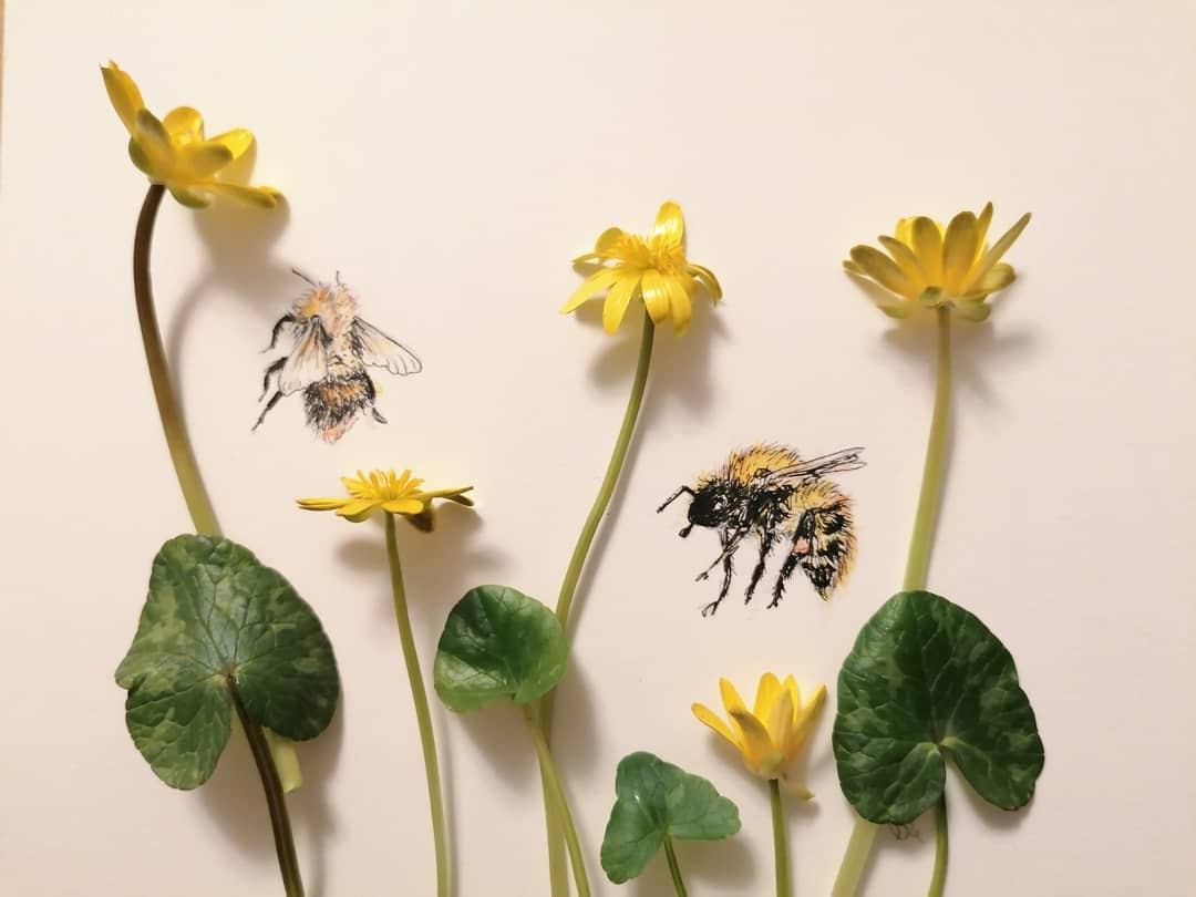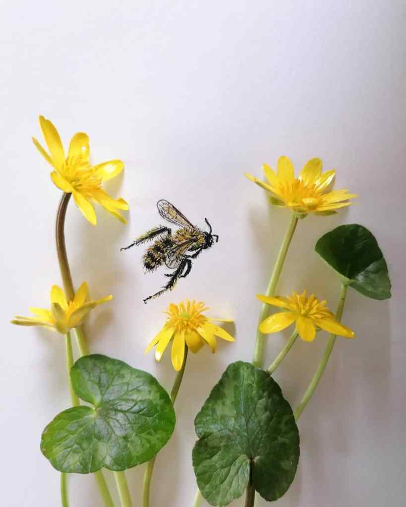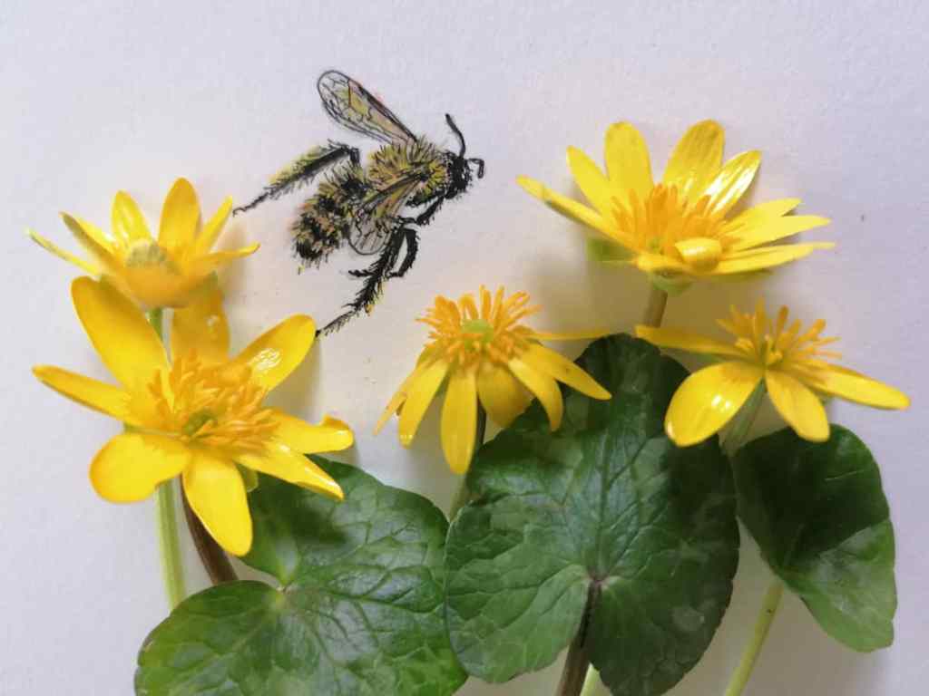 After photographing the new bee with the Celandines, I then placed the flowers with some of the other bees and the peacock butterfly that I’ve drawn recently.
