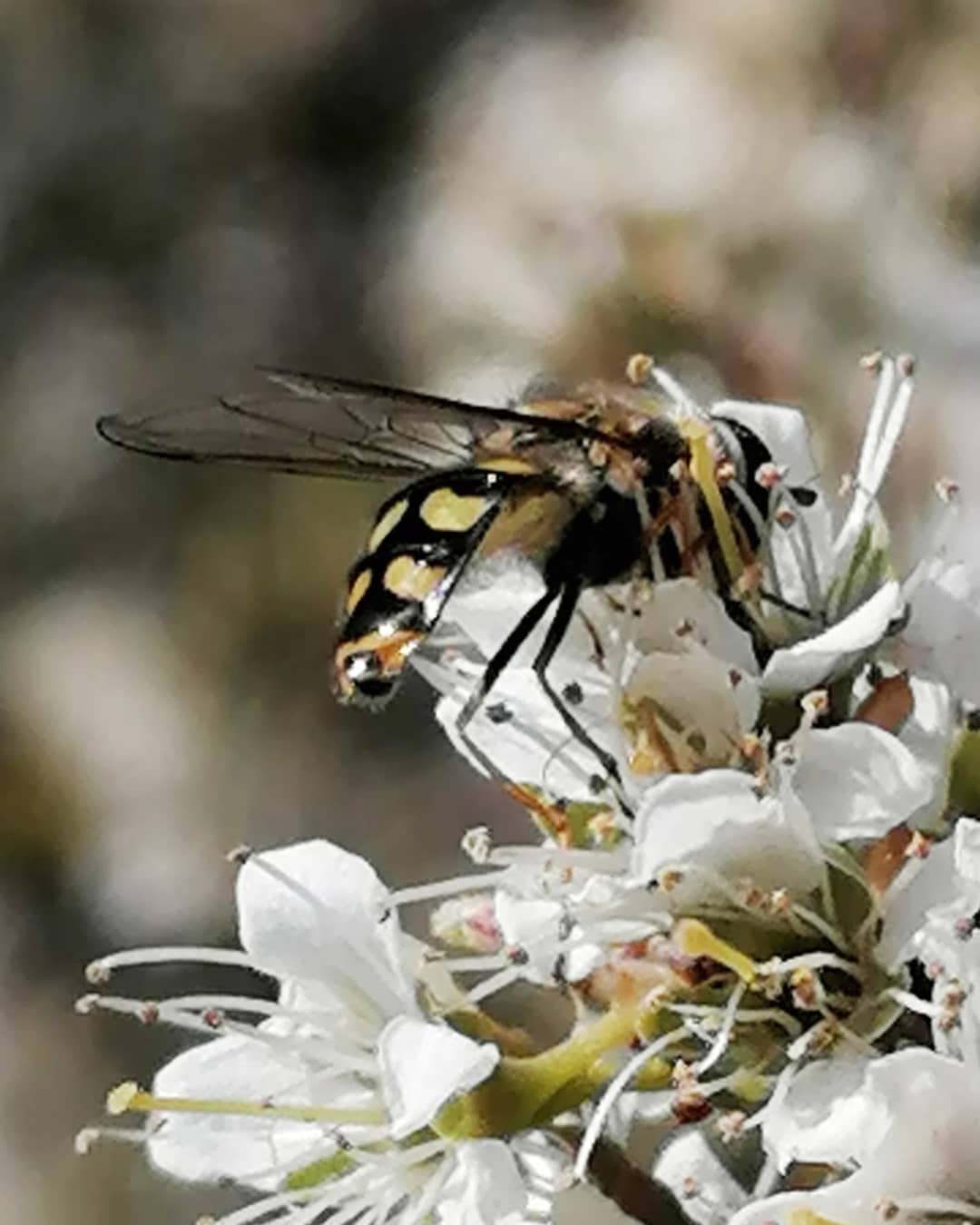 Next I spotted what is either a Migrant Hover Fly (Eupeodes corollae) or a Black-tailed Aphideater (Eupeodes luniger), but I’m not sure which. It was enjoying the blackthorn blossom.