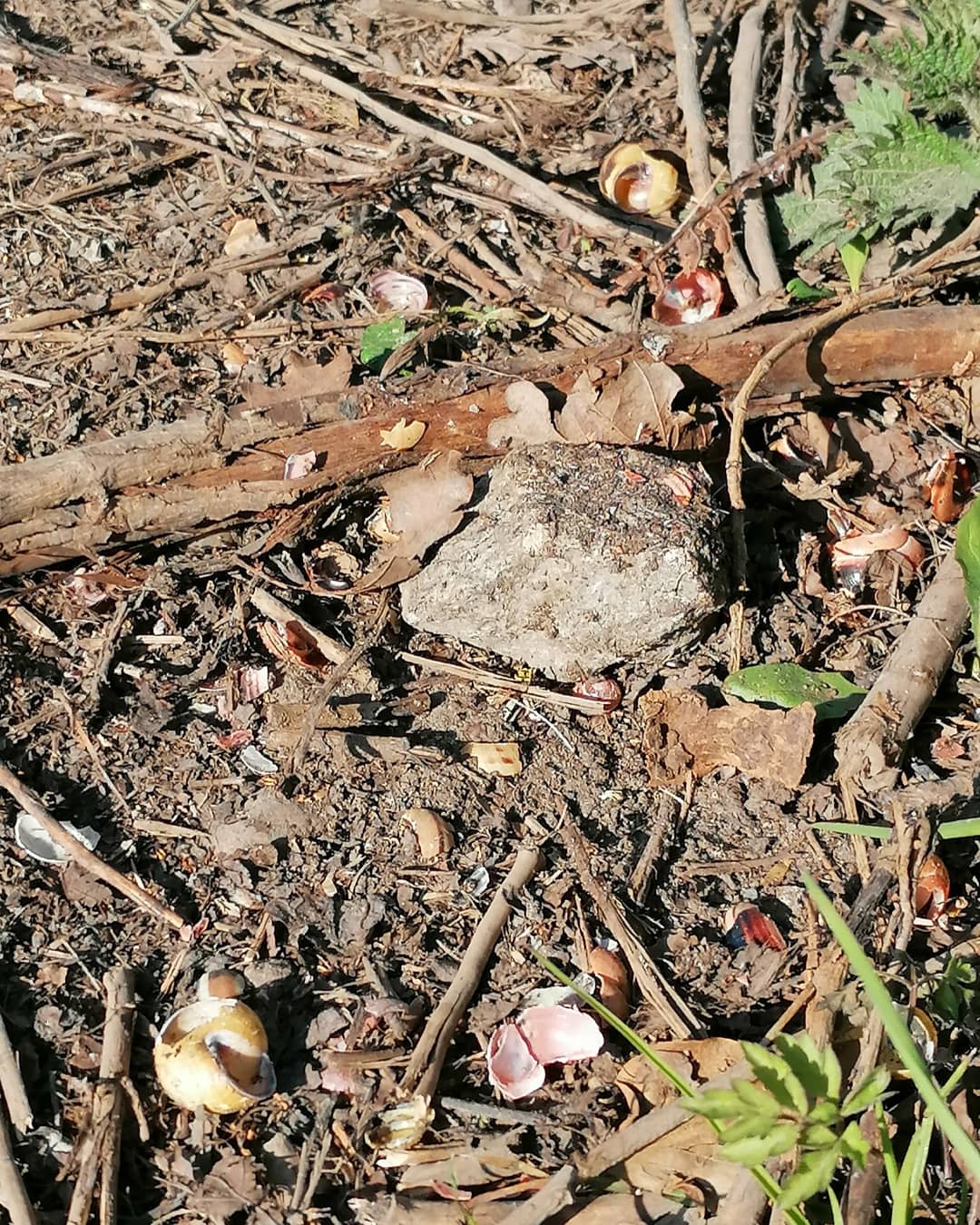 At the edge of the lane outside the meadow I also spotted a stone surrounded by broken snail shells. I think this is probably a thrushs’ anvil, a stone used by a song thrush in order to break open the shells so it can eat the soft bodies inside.