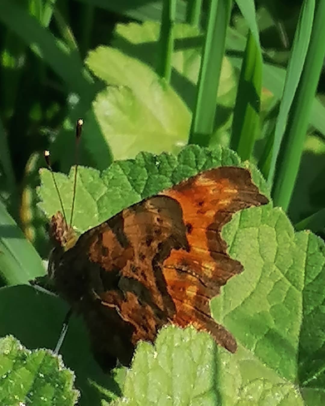 I spotted a Comma butterfly in the hedgerow. The ragged shape of this butterfly’s wings and the mottled brown colouring of the outside, allow the hibernating adults to hide in among dead leaves over winter, never revealing the colourful display within.